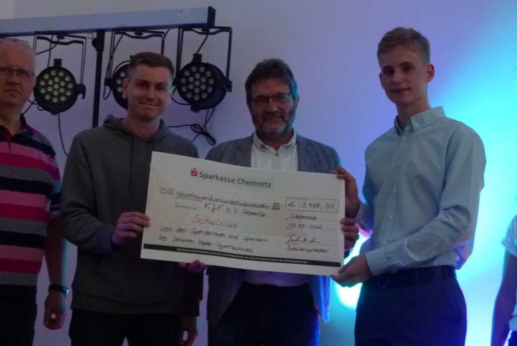 Diese Gelegenheit nutzten wir, um dem KJF, vertreten durch Herrn Vogel, dem stellvertretenden Geschäftsführer, feierlich den Check des Spendenlaufs zum Erhalt des Schulclubs zu übergeben.
