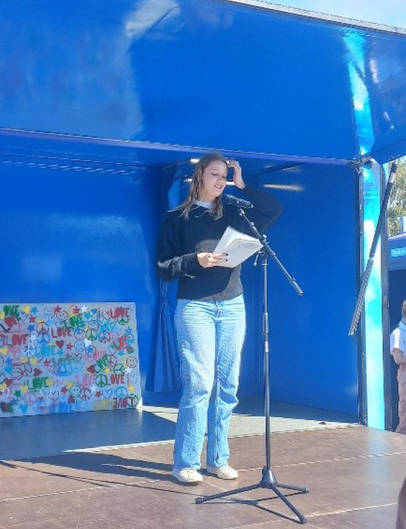 Auch Lara Schilling, aus der Klasse 10-3, hielt mit der Hilfe der Schülerinnen und Schüler eine Rede über die Bedeutung von Frieden. Für diese Rede konnte jeder Schüler per LernSax seine Definition des Wortes „Frieden“ einsenden, die dann erwähnt wurden. Die Rede könnt ihr an dieser Stelle nachlesen. Ihre Rede war mitreißend, nachdenklich stimmend, enthusiastisch und hat unsere Schule sehr gut vertreten. Als Leiterin der AG „Schule ohne Rassismus, Schule für Courage“ und jetzige Beirätin der Schüler*innenvertretung wollte sie sich dem Thema besonders widmen. In ihrer Rede baute sie einige der vorher erarbeiteten Wortmeldungen der Schülerschaft mit ein. Im Rahmen des GRW-Unterrichts hatten einige Schülerinnen und Schüler Plakate für den Friedenstag gestaltet, die im Sportforum gezeigt wurden.
