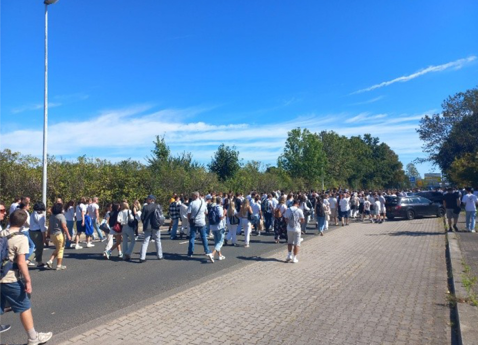 Um 10:45 Uhr trafen alle Schülerinnen und Schüler des Johannes-Kepler-Gymnasiums aus den Klassenstufen 7-12 am Sportforum ein. Aufgrund des Stadtradelns, welches vom 1. September bis zum 21. September stattfindet, erschienen viele Schülerinnen und Schüler mit dem Fahrrad. Einige nutzten die Gelegenheit, um mit einer „Friedensfahrt“, die gewonnene Zeit zu nutzen. Um Courage zu zeigen, trugen die meisten Teilnehmer*innen Schule weiß, die Farbe des Friedens.