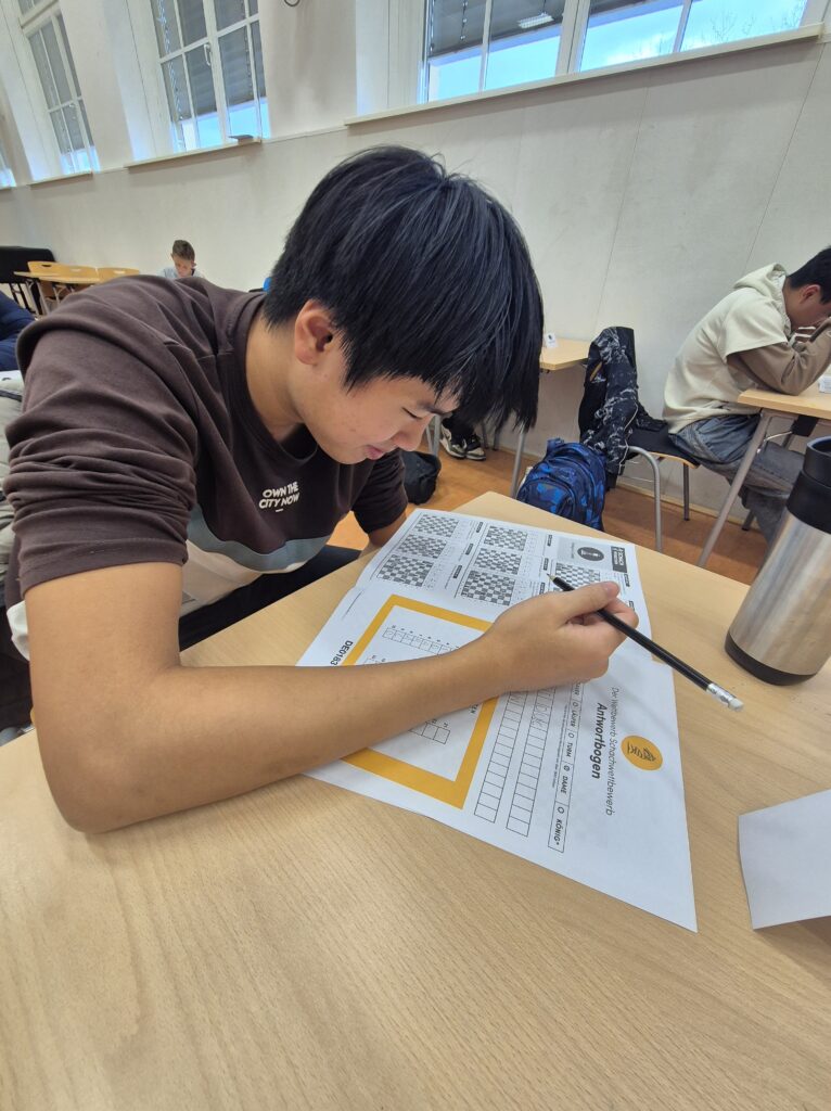 In der (im wahrsten Sinne des Wortes) Königskategorie durften nur richtig Schacherfahrene teilnehmen: eine Mindestzahl von 1600 ELO-Punkten war hier Zugangsvoraussetzung. Dies ist eine international gültige Schachwertungszahl. Ich möchte an dieser Stelle gern Herrn Beyer zitieren, der nach Bearbeitung der Aufgaben sagte: „Mein lieber Scholli, die Aufgaben sind seeeehr schwer.“ – und das will bei einem eingefleischten Schachfanatiker wie ihm schon etwas heißen. Besonders ein Schüler unserer Schule stach hier heraus: Joshua Li (8-3) schaffte es in einer erlesenen Auswahl mit 130/150 möglichen Punkten bei 29 deutschen Königen in die Top 3 zu kommen! Herzlichen Glückwunsch! Außerdem haben Silas Uhlig (8-1), Mika Zielke (6-4) und Tamino Hensel (9-3) teilgenommen.