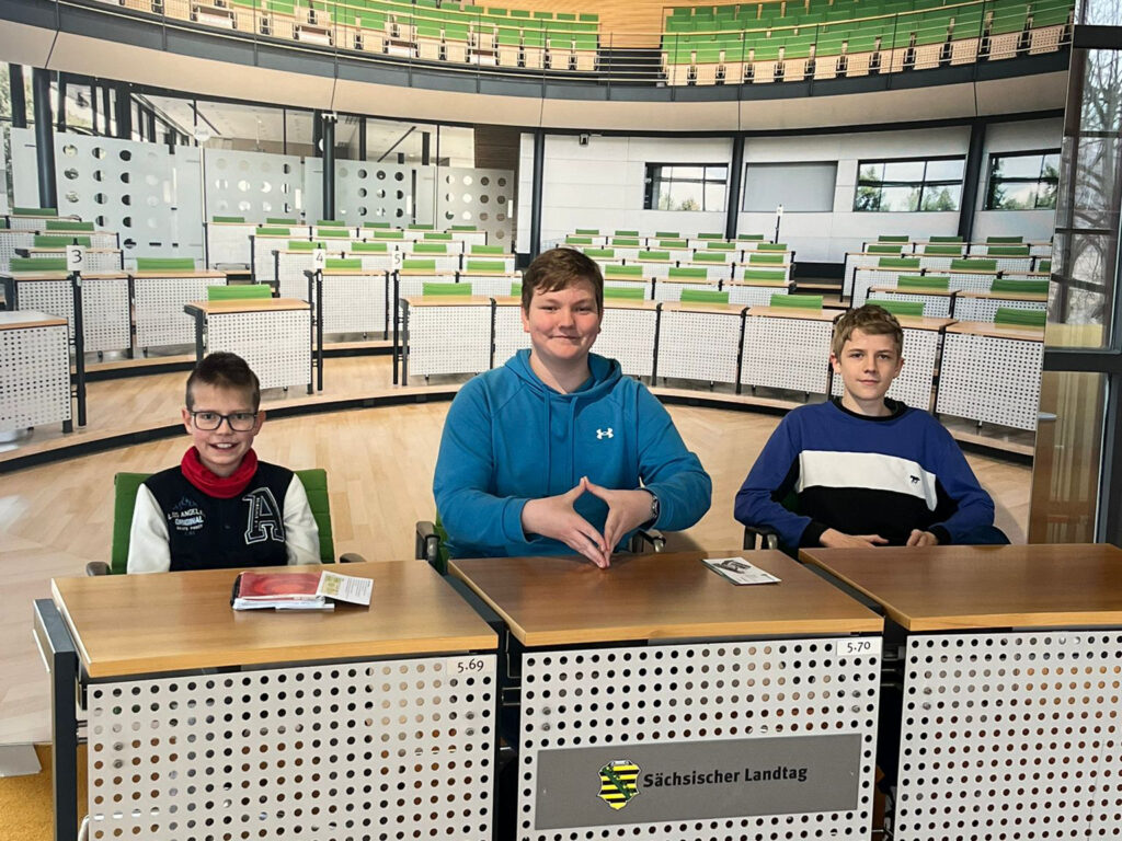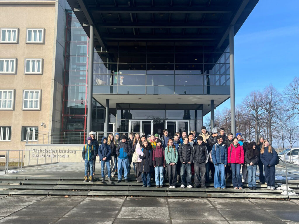 Am 5. und 6. Februar begaben sich die 8. Klassen auf eine spannende Exkursion in der sächsischen Landeshauptstadt Dresden. Wir trafen uns pünktlich um 10:30 Uhr am Chemnitzer Hauptbahnhof. Dann begann unsere Reise mit einer entspannten Zugfahrt. Nach der Ankunft am Hauptbahnhof hatten wir zunächst 20 Minuten Zeit, uns dort frei zu bewegen, bevor wir mit der Straßenbahn weiter zum Landtag fuhren. Bevor wir schließlich das Gebäude betraten, nutzten wir die Gelegenheit für ein gemeinsames Klassenfoto vor der Kulisse des Landtages, um den Tag festzuhalten.