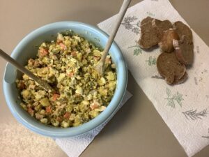 Wir, die Russisch Klasse 9, haben im Unterricht einen traditionellen russischen Salat, namens “Салат Оливье”, zubereitet und danach mit Brot verkostet.