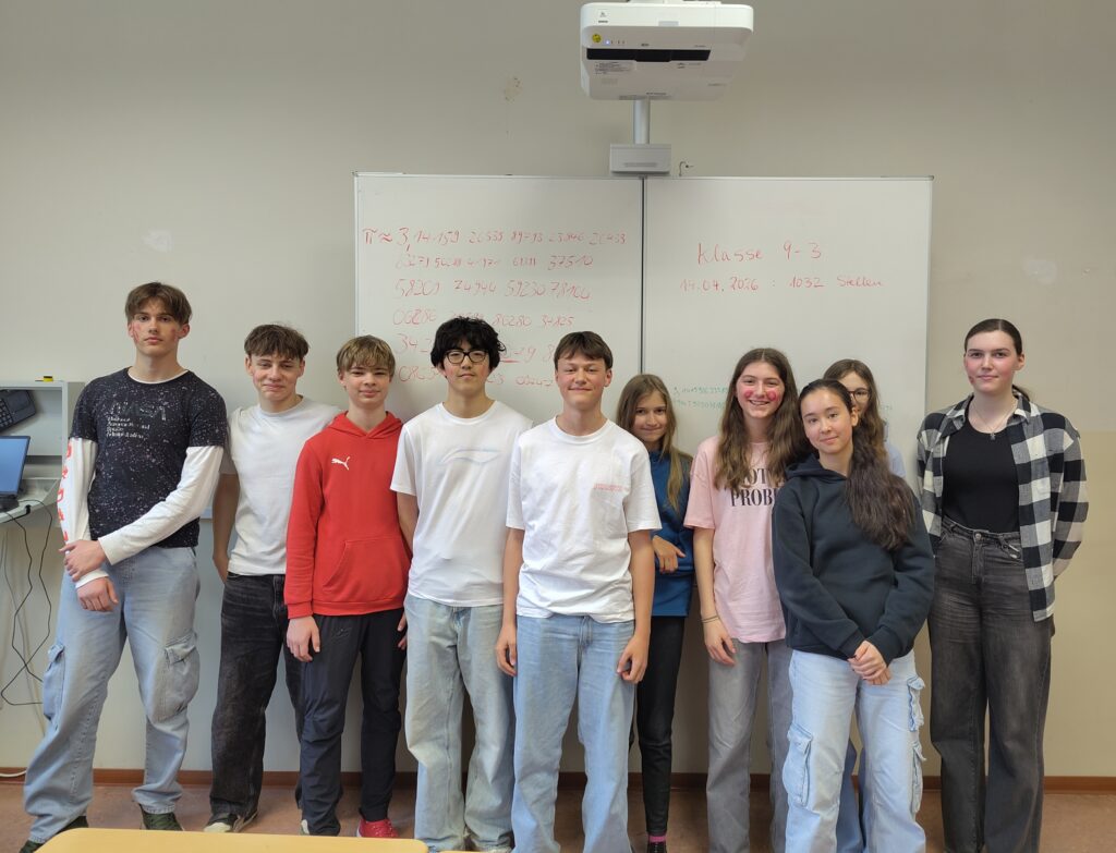 So konnten in Summe 1032 Nachkommastellen (beginnend stets ab 141592653 … ) angeben werden. Damit wurde zwar die herausfordernde Leistung der ehemaligen Klasse 9-2 aus dem Schuljahr 2023/24 (mit 1194 Stellen) nicht überboten, dennoch setzen wir die Tradition des Pi-Wettbewerbs an unserer Schule fort. Amadeo kam auf stolze 130 Nachkommastellen.